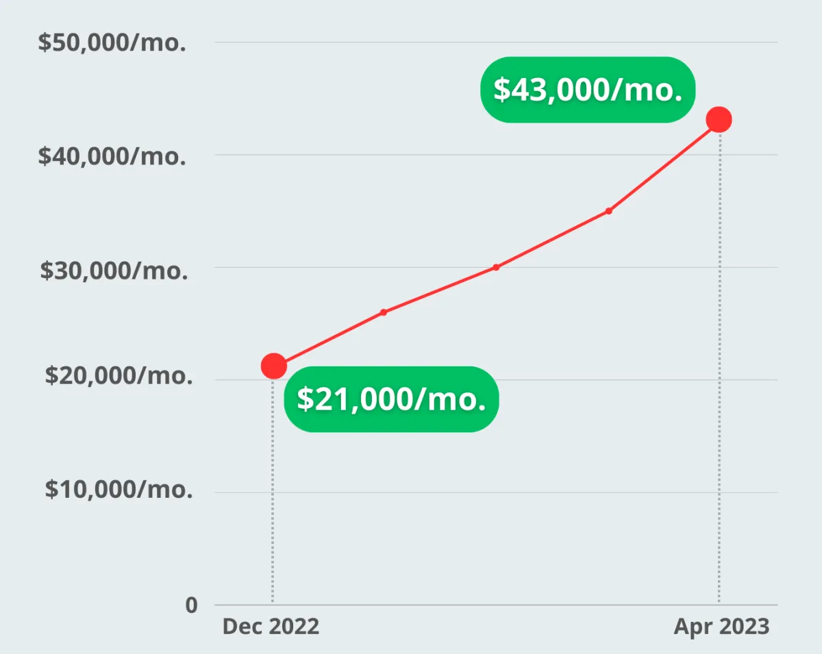 Results: In April 2023, Arden's omni-channel ROAS reached 2.6X, increasing her monthly revenue to $43k, reflecting a 104.76% increase in monthly revenue over 4 months.