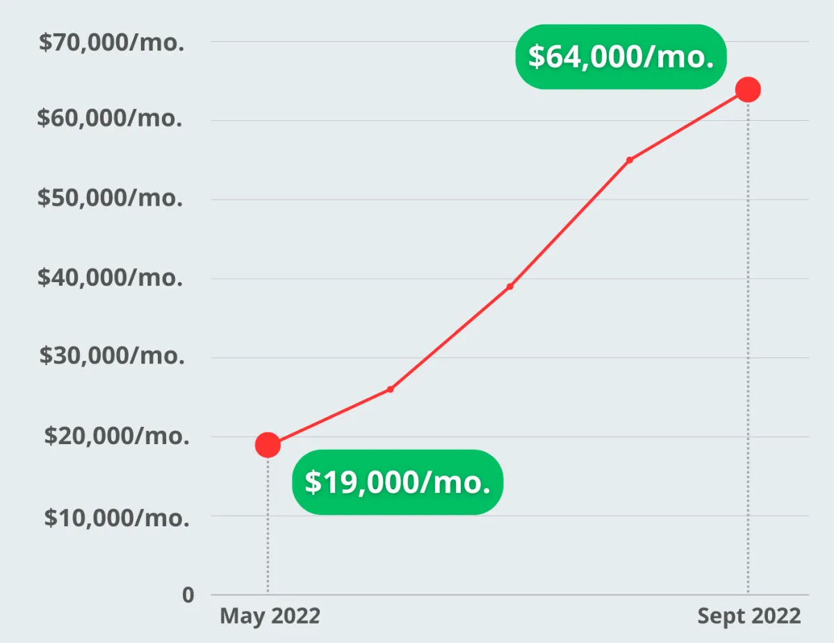 Results: By September 2022, Ad Buyers U's monthly revenue skyrocketed to $64k, reflecting a 236.84% increase over 5 short months.